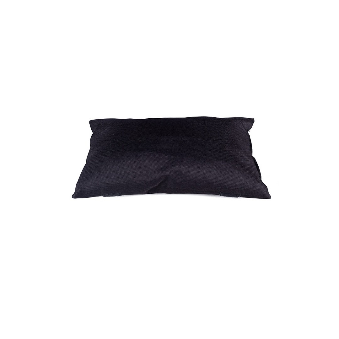 Columpio de tela negro con todos los accesorios incluidos: ganchos con mosquetones metálicos, reposapiés acolchados (11 cm de ancho) y cojín (23 x 38 cm). La funda tiene forma rectangular.