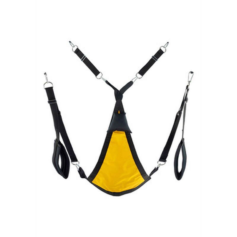 Este columpio de tela amarillo tiene forma triangular y está fabricado con tela de camuflaje. Se ajusta con 3 o 4 puntos de fijación. Incluye los siguientes accesorios: 4 ganchos con mosquetones metálicos, reposapiés acolchados (11 cm de ancho) y un cojín triangular negro (24 x 20 cm).