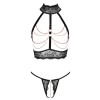 Conjunto seductor sin entrepierna de Abierta Fina, compuesto por un top con copas abiertas y un tanga a juego. El encaje negro, suave y elástico, combina con tirantes de terciopelo y cadenas en tono oro rosa, creando un look sofisticado y provocativo.