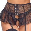 Conjunto de la colección Abierta Fina compuesto por un sujetador tipo balconette, una falda con ligas y un tanga sin entrepierna. Las tres piezas están confeccionadas en encaje negro suave, delicado y elástico, con elegantes detalles en tono oro rosa.