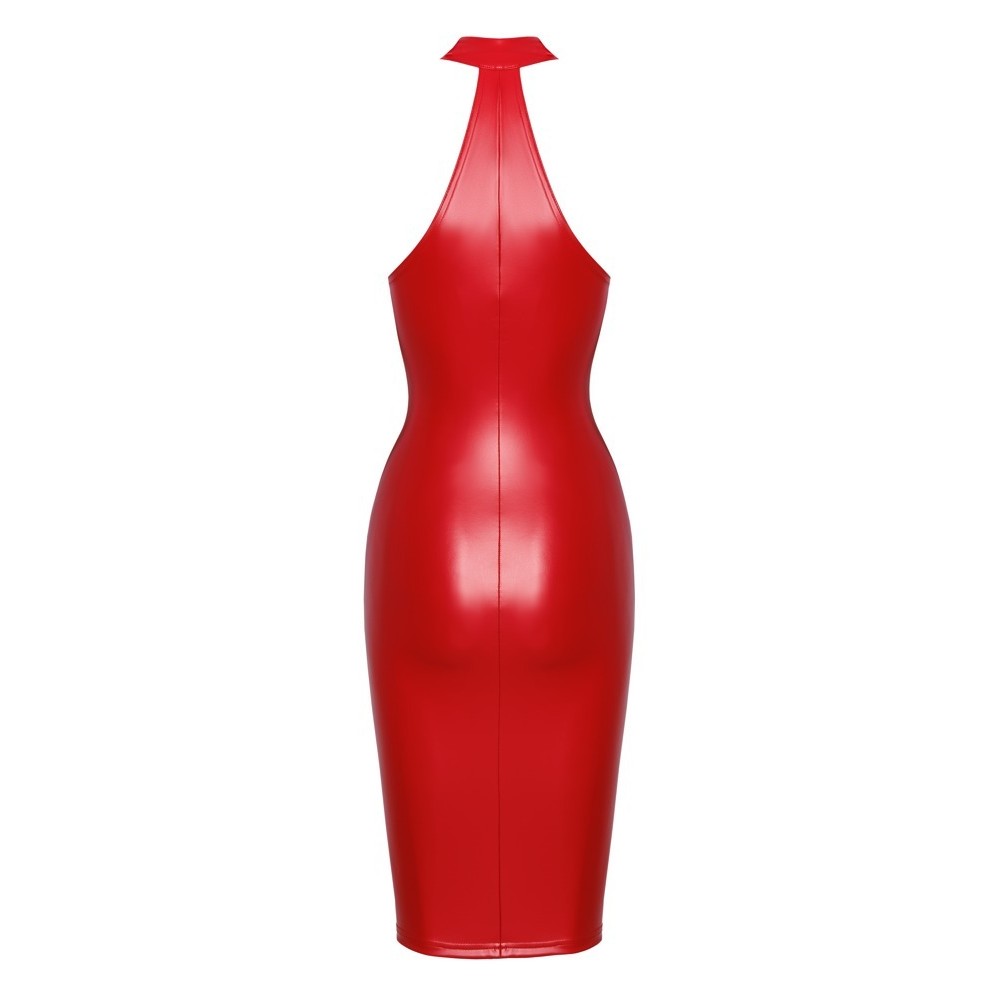El vestido de hombros descubiertos y largo hasta la rodilla de Noir tiene un diseño cónico. Está confeccionado en powerwetlook, un tejido que se adhiere sensualmente al cuerpo. Tiene un color fantástico: rojo vivo. Además, es suave y elástico, lo que lo hace muy cómodo de llevar. Tiene una cremallera que recorre toda la longitud, desde el cuello alto hasta la larga abertura.