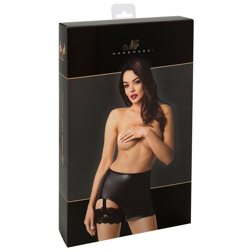 La minifalda ajustada de Noir está confeccionada en elegante powerwetlook. Una gran parte del dobladillo es curvada. El liguero con la liga de encaje está cosido de forma segura en la parte curvada del dobladillo. Todo es suave y elástico para un ajuste ceñido pero muy cómodo.