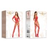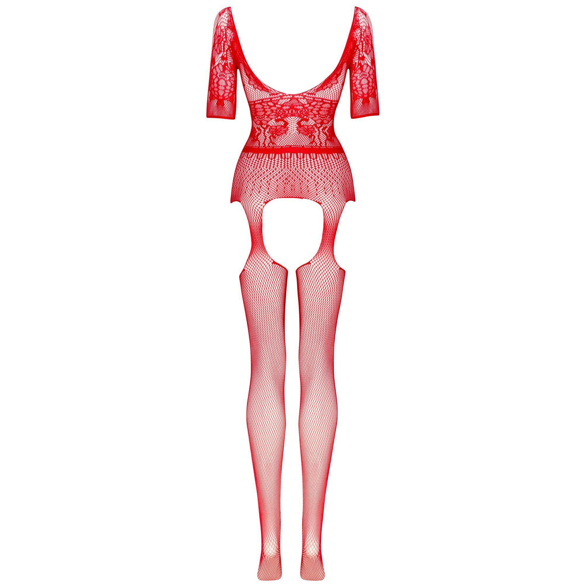 Catsuit super sexy para las amantes de la ropa interior cómoda, confeccionado en hilo rojo delicado. La parte superior es una sexy camiseta de manga corta decorada con aplicaciones florales y un cinturón que realza la cintura. La parte inferior son unas medias clásicas.