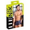 Los pantalones cortos esbeltos y destacados de NEK tienen un cierre de cremallera sobre el bolsillo acolchado. Los pantalones cortos están hechos de material mate azul metálico y tienen tirantes con tachuelas a ambos lados.