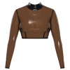 El crop top de LateX está hecho de látex natural (pegado) en un color ahumado transparente. Tiene mangas largas y un gran aro metálico decorativo en la parte delantera, debajo del elegante cuello alto. Tiene una cremallera completa en la espalda que facilita ponérselo y quitárselo.