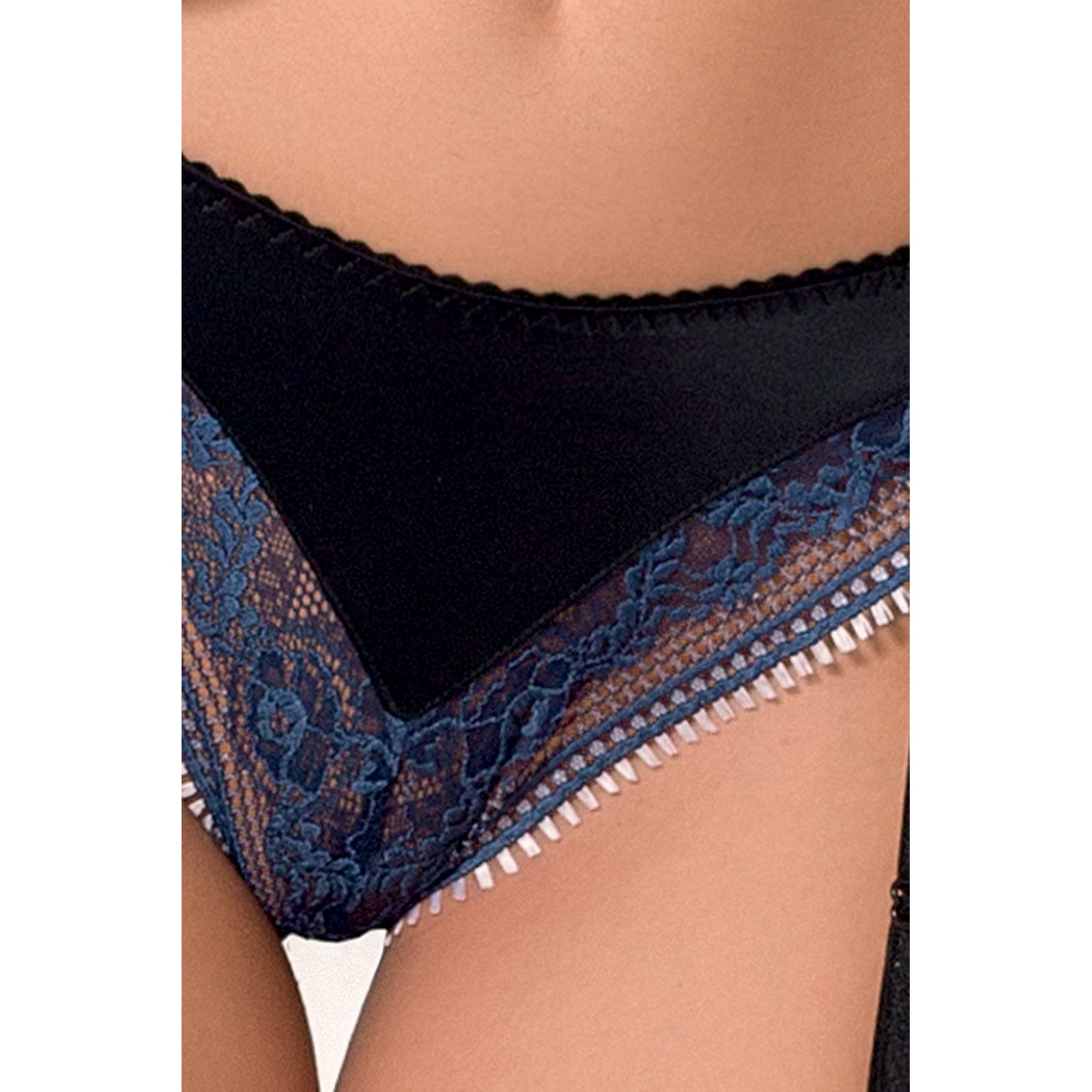 Conjunto azul de encaje y microfibra con sujetador de copas reforzadas y tanga con liguero incorporado, para un toque sensual y elegante.