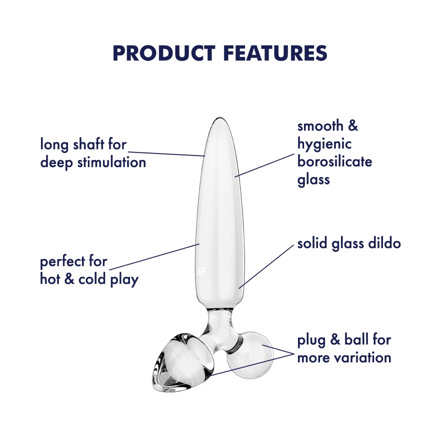 ¡Este consolador de cristal Satisfyer está aquí para proporcionarte un triple placer! Con un consolador cónico de 21 cm de largo y dos plugs más pequeños de diferentes formas, tú eliges: úsalo para la estimulación anal o vaginal, estimula solo las partes externas de tus puntos erógenos o ve más profundo, tal y como desees; gracias a su forma especial, es seguro para todo tipo de placeres.