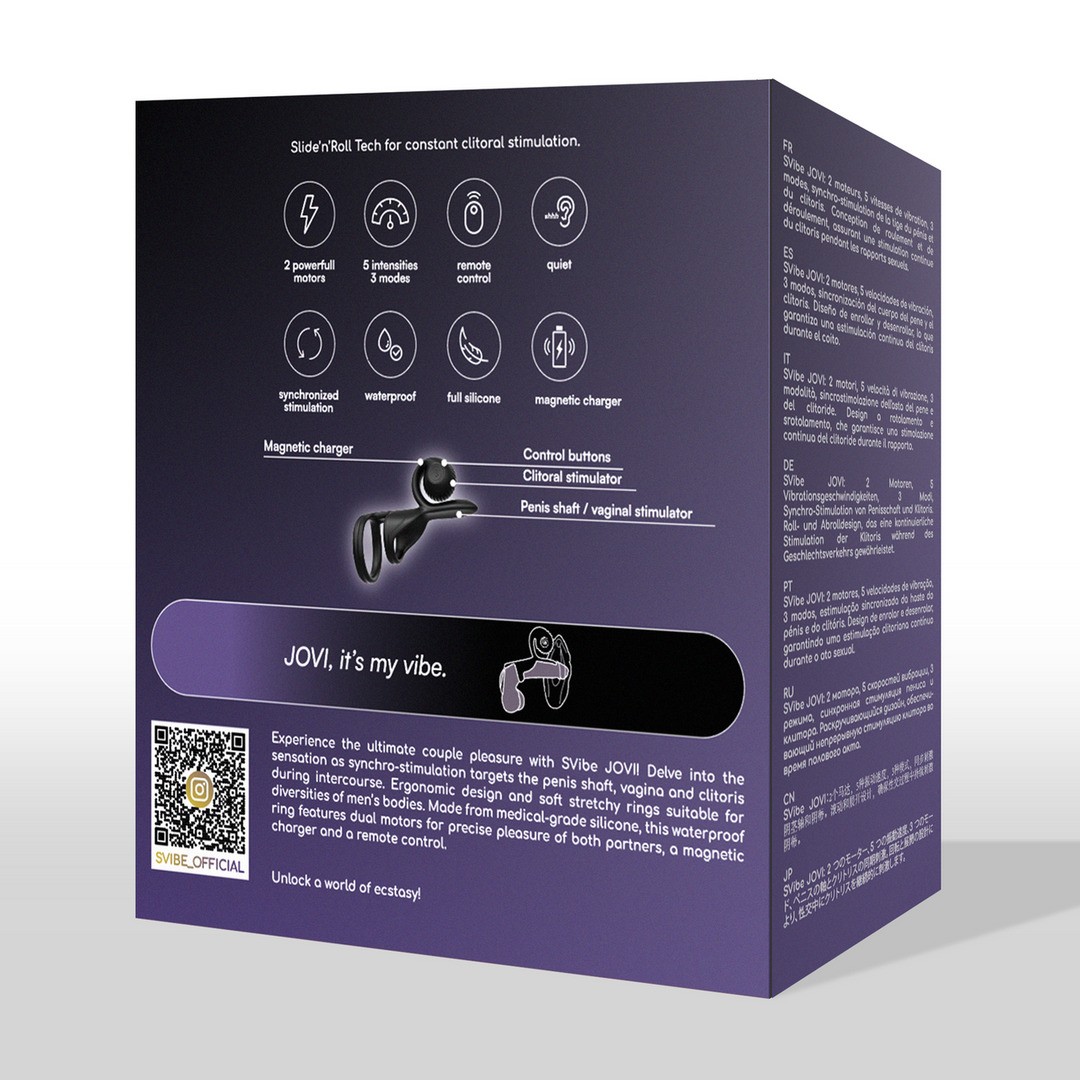 ¡Experimenta el placer en pareja con SVibe JOVI! Disfruta de la estimulación sincronizada del pene, la vagina y el clítoris durante el acto sexual. El diseño ergonómico y los anillos elásticos suaves se ajustan a diferentes cuerpos masculinos.