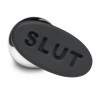 Plug anal metálico con base de silicona y la inscripción SLUT, perfecto para juegos atrevidos y excitantes.