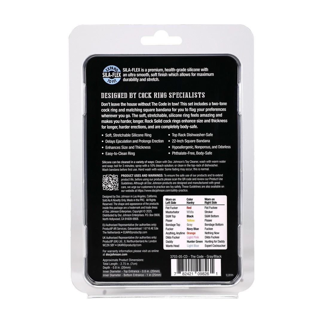 No salgas de casa sin The Code! Este conjunto incluye un anillo para el pene bicolor de silicona suave y elástica, junto con un pañuelo cuadrado a juego, para que puedas mostrar tus preferencias allá donde vayas.