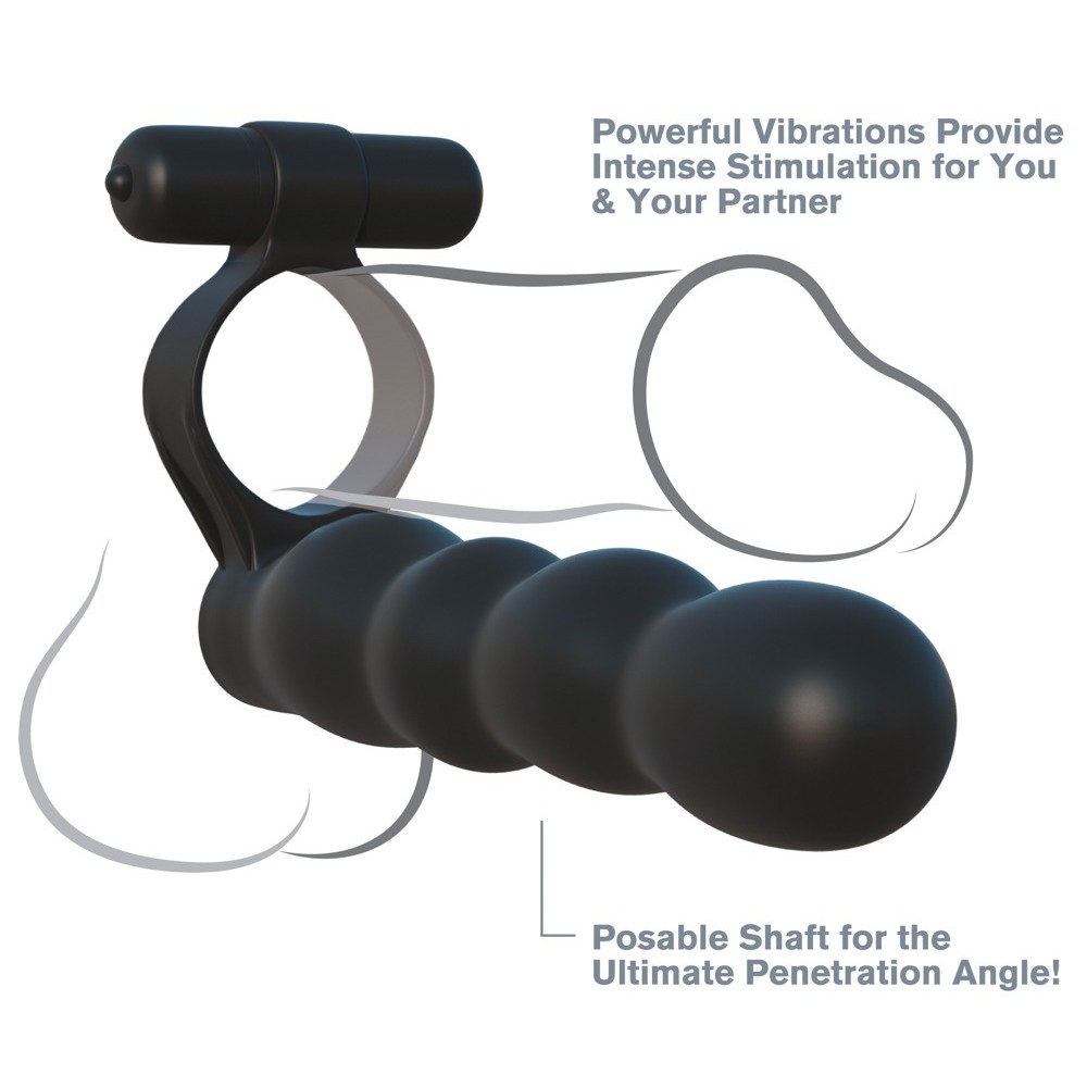 Anneau pénien à fixation sûre avec vibromasseur insérable et perles anales intégrées. L'anneau se place sur le pénis, vous permettant de profiter d'un effet double pénis, combiné à un stimulateur clitoridien vibrant pour une triple stimulation intense. L'anneau pénien aide également à maintenir efficacement l'érection grâce à l'effet de congestion sanguine. La petite et puissante balle vibrante s'insère dans l'anneau supérieur, offrant une stimulation supplémentaire et excitante. La balle vibrante est étanche et peut être utilisée dans le bain ou sous la douche.