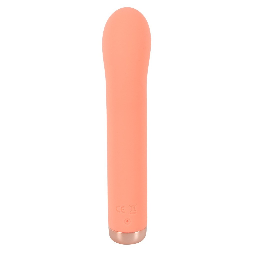 Élégant mini vibrateur point G aux couleurs pastel de Peachy!, avec un design parfaitement incurvé et une tête arrondie pour une stimulation directe du point G ou du point P. Les 10 modes de vibration offrent une grande variété de sensations pendant la stimulation vaginale et anale, et peuvent être facilement réglés vers le haut ou vers le bas d'une simple pression sur un bouton.