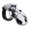 Cage à pénis en silicone ferme, équipée d'un harnais, de vis, de trois entretoises, d'une serrure métallique avec deux clés, d'un câble d'électrodes, de cinq sceaux synthétiques et de dix signes de possession. Un ensemble complet pour un contrôle sûr et confortable.
