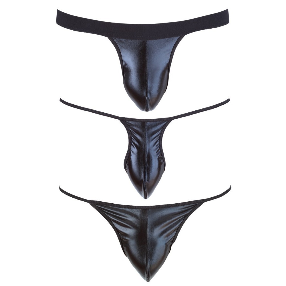 C'est toujours pratique d'avoir ces trois strings dans son tiroir à sous-vêtements : un mini-string, un mini-G-string et un jockstrap. Tous sont confectionnés dans une matière élastique noire, avec une finition brillante et un effet mouillé.