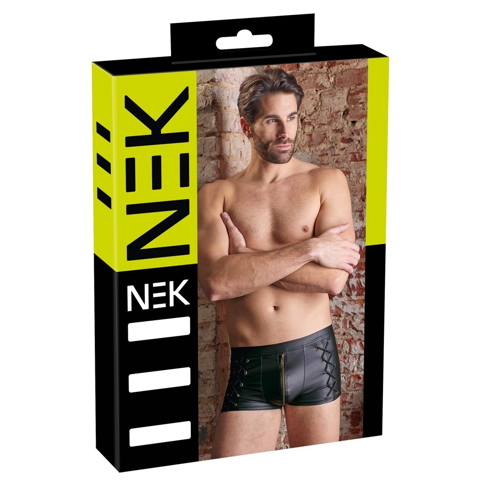 Short noir doté d'une fermeture éclair en laiton rembourrée à l'avant et de cordons décoratifs sur les côtés. Avec une ceinture doublée de tissu, il est confectionné dans une matière ajustée et élastique qui garantit un ajustement parfait et un grand confort.