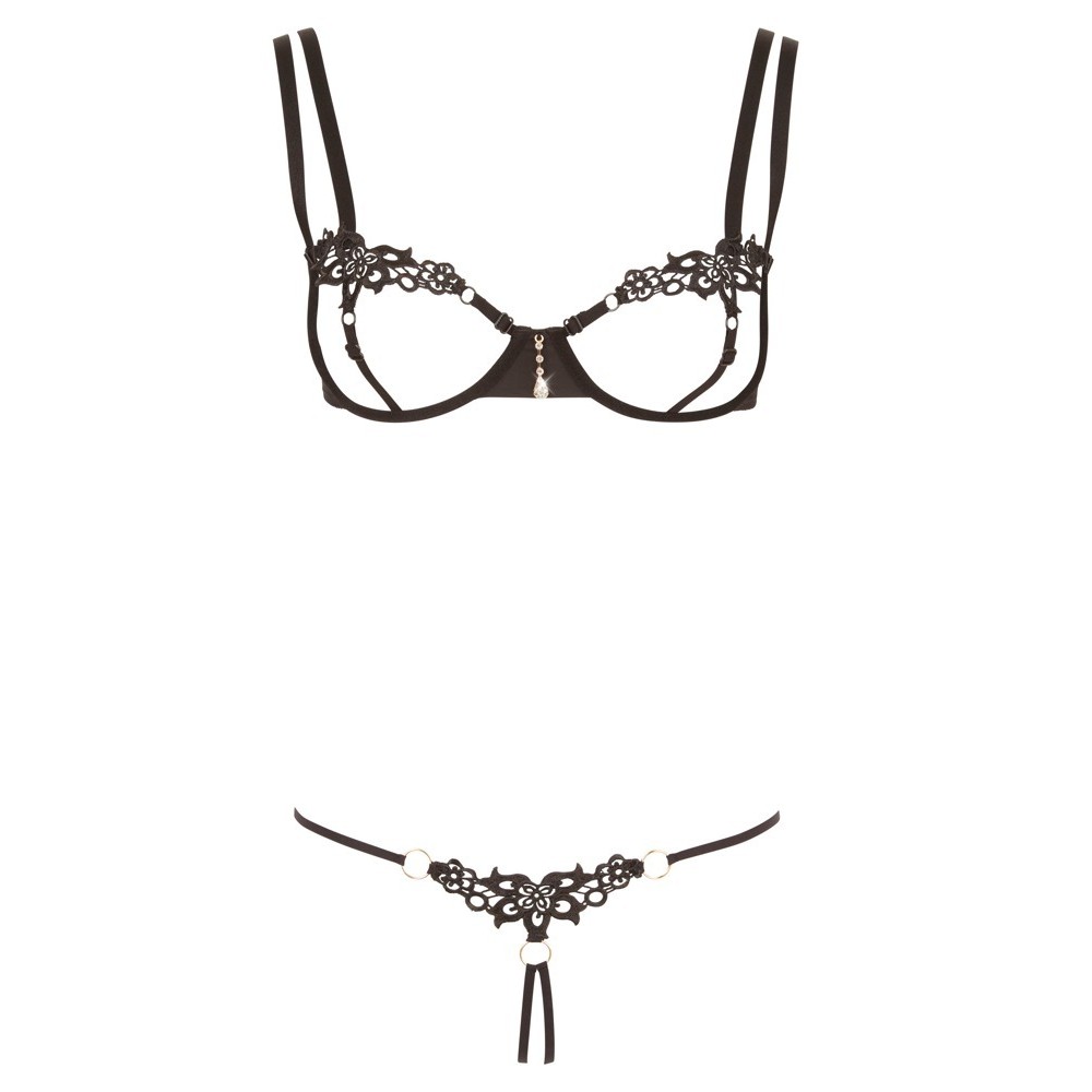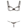 Le soutien-gorge à bonnets ouverts est composé uniquement d'armatures et de bretelles, offrant une vue irrésistible, les tétons étant uniquement recouverts de délicates broderies. Il est doté d'un fermoir à agrafes dans le dos et de bretelles réglables pour un ajustement parfait. Le string assorti est ouvert au niveau de l'entrejambe et présente une broderie élégante à l'avant, reliée aux bretelles par trois petits anneaux argentés.