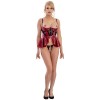 Soutien-gorge à décolleté plongeant avec volants et strass et string en dentelle sans entrejambe, dans un ensemble Abierta Fina. Le soutien-gorge à décolleté plongeant, confectionné dans un tissu mat et une dentelle délicate, possède des bonnets légèrement rembourrés. Il rehausse et met en valeur la poitrine, l'encadrant de chaînes rose doré qui la placent au centre de l'attention. La taille présente un élégant effet ceinture, rehaussé par une grande boucle ornée de strass, tandis que les hanches sont sensuellement mises en valeur par de légers volants ondulés.
