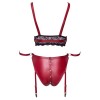 Soutien-gorge, string et porte-jarretelles Cottelli BONDAGE en élégant tissu rouge mat, avec de délicates incrustations de dentelle noire et des détails métalliques argentés. Le soutien-gorge séduisant est doté de bonnets fendus qui s'ouvrent facilement à l'aide de boutons-pression. Les bretelles du soutien-gorge et la bande sous la poitrine sont réglables pour un ajustement parfait. Le string à jarretelles est également muni de boutons-pression et peut être ouvert de la partie supérieure de l'entrejambe jusqu'à la partie supérieure des fesses. Il y a des anneaux sur les côtés et à l'arrière, et les deux fermoirs inclus (avec crochet et anneau) peuvent être fixés à ces anneaux. Les lanières du porte-jarretelles sont réglables et peuvent être complètement retirées.