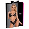 Ensemble Cottelli LINGERIE composé d'un soutien-gorge souple et d'un string, en dentelle noire élastique et douce, avec d'élégantes bandes de velours sur le soutien-gorge et à la taille du string. Le soutien-gorge présente une armature décorative entre les bonnets, des bretelles doubles élastiques à l'avant et des bretelles réglables à l'arrière, ainsi qu'une fermeture à agrafes dans le dos. Le string se distingue par sa petite découpe à l'avant avec un anneau décoratif à la taille et par un délicat fil de perles noires cousu dans la zone intime, pour une sensation subtilement stimulante à chaque mouvement.