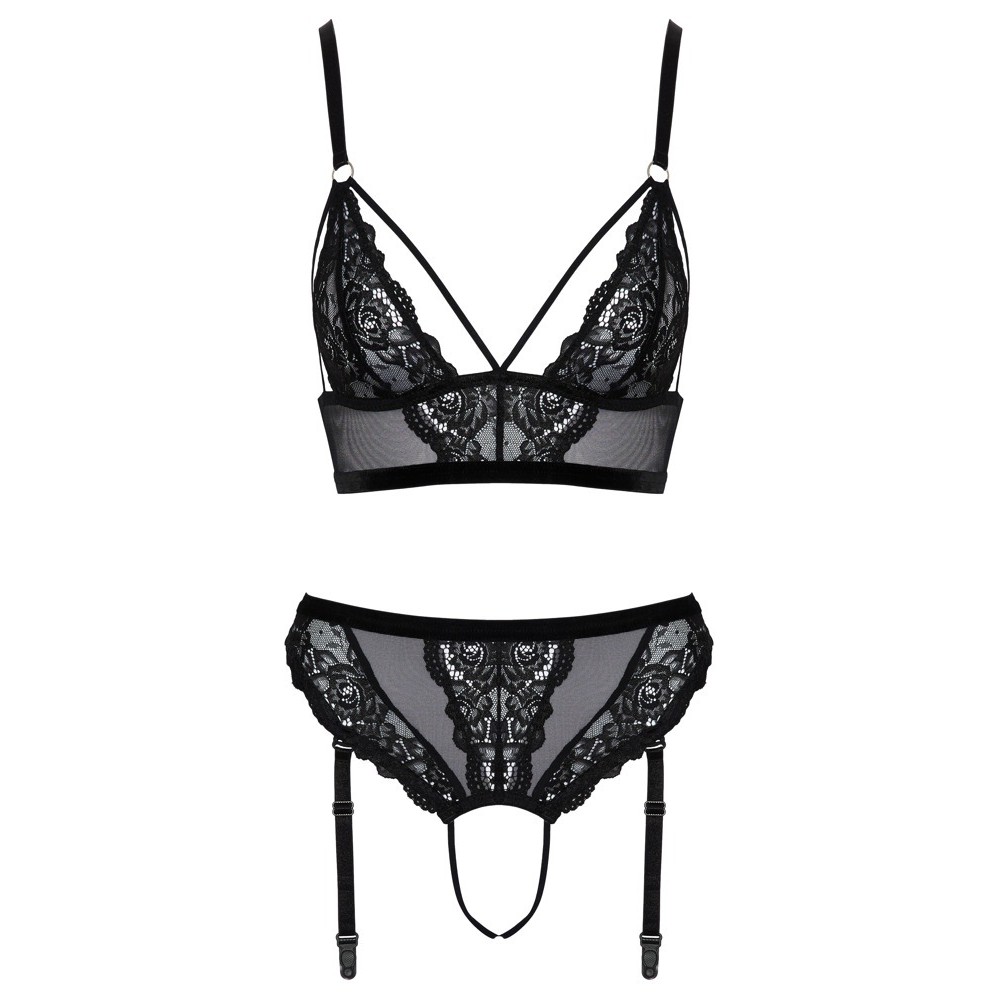 Ensemble Cottelli LINGERIE composé d'une bralette longue et d'un string taille haute avec partie intime entièrement ouverte, dans un délicat mélange de dentelle noire et de powernet. La matière douce et élastique garantit un confort élevé. La bralette se distingue par ses bretelles élastiques au niveau du décolleté, tandis que les bretelles et les jarretelles sont réglables et entièrement amovibles.