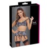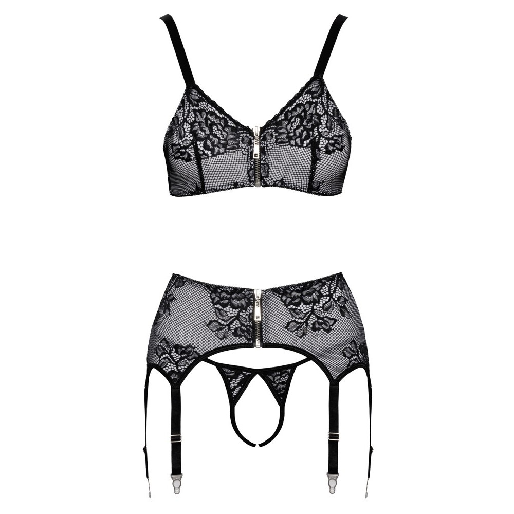 Soutien-gorge souple, ceinture de suspension et ensemble string sans entrejambe de Cottelli LINGERIE. Les 3 pièces de lingerie sont noires avec des devants blancs recouverts de fine dentelle noire. La matière souple et élastique les rend très confortables à porter. Les détails en métal argenté complètent le look élégant. Le soutien-gorge et la ceinture de suspension ont une fermeture éclair à l'avant et un crochet à l'arrière. Les bretelles et les 6 jarretelles sont réglables. Le string séduit par son entrejambe complètement exposé.