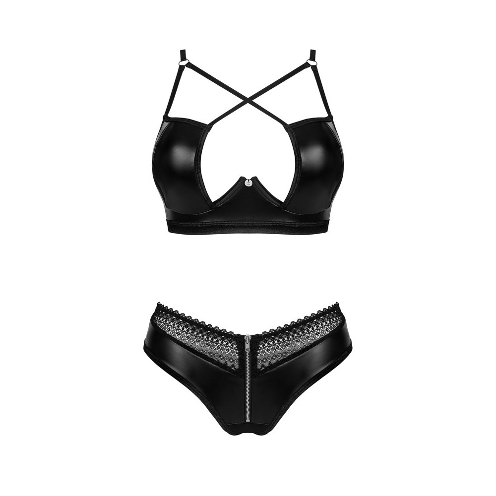 Ensemble deux pièces noir Norides, de la marque Obsessive, composé d'un soutien-gorge à armatures et d'un string élastique et doux, de style mouillé. Le soutien-gorge présente une coupe sophistiquée, avec des bretelles réglables et un décolleté extravagant, tandis que l'agrafe dans le dos permet un ajustement personnalisé. Le string séduit avec ses inserts en dentelle à la taille et sa fermeture éclair sur le devant.