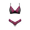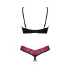 Ensemble Rosenty, de Obsessive, composé d'un soutien-gorge à armatures et d'un string sans entrejambe. Maille noire douce associée à une fine dentelle rose, créant un mélange élégant avec un tissu élastique opaque. Le soutien-gorge présente un délicat élément décoratif entre les bonnets, une armature et un fermoir à agrafes réglable dans le dos, tandis que les bretelles sont réglables pour un ajustement parfait. Le string séduit par sa taille en dentelle et son ouverture provocante à l'entrejambe.
