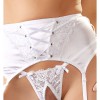 La ceinture porte-jarretelles présente un nœud décoratif et une fermeture à agrafes dans le dos. Les bretelles du soutien-gorge et de la ceinture sont réglables pour un ajustement parfait. Le string est séduisant et ouvert au niveau de l'entrejambe, complétant l'ensemble avec une touche provocante.