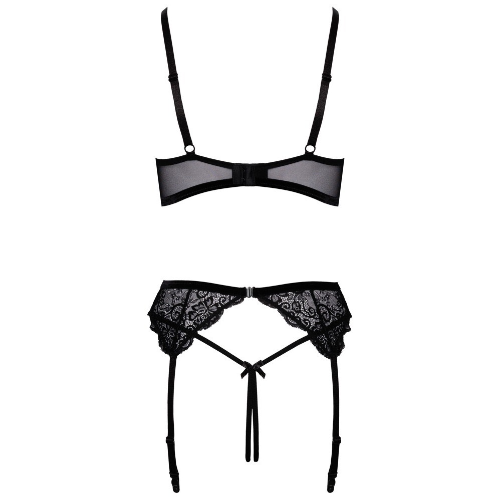 Ensemble Cottelli LINGERIE composé d'un soutien-gorge à balconnet, d'un porte-jarretelles et d'un string sans entrejambe. Toutes les pièces sont confectionnées en dentelle noire douce et élastique, ornées d'anneaux argentés et d'élégants détails en velours.