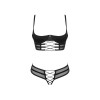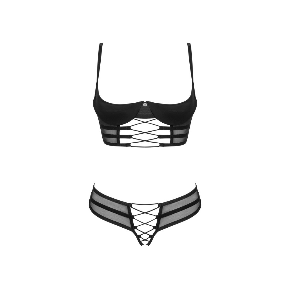 Soutien-gorge à décolleté profond et allongé et string ouvert à l'entrejambe dans l'ensemble Roxelia d'Obsessive. Un style élégant conçu en tulle transparent associé à un tissu élastique opaque. Doux et souple pour un confort optimal. La partie avant plus longue, avec des bonnets rembourrés et une armature, met en valeur et rehausse la poitrine. On remarque également le détail en forme de nœud avec ruban et le petit élément de bijouterie entre les bonnets. Bretelles élégantes et réglables, avec fermeture à agrafes réglable dans le dos. Le string séduit avec ses rubans de dentelle à l'avant et son entrejambe ouvert.