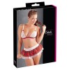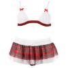 Motif à carreaux rouges associé à de la dentelle blanche et du tulle. Le soutien-gorge sans armatures est doté de bonnets en dentelle blanche, de bretelles réglables et d'une fermeture dans le dos. Il comprend une minijupe à deux couches, avec une taille en dentelle et un jupon en tulle visible sous la jupe. Il comprend également un string sans entrejambe.