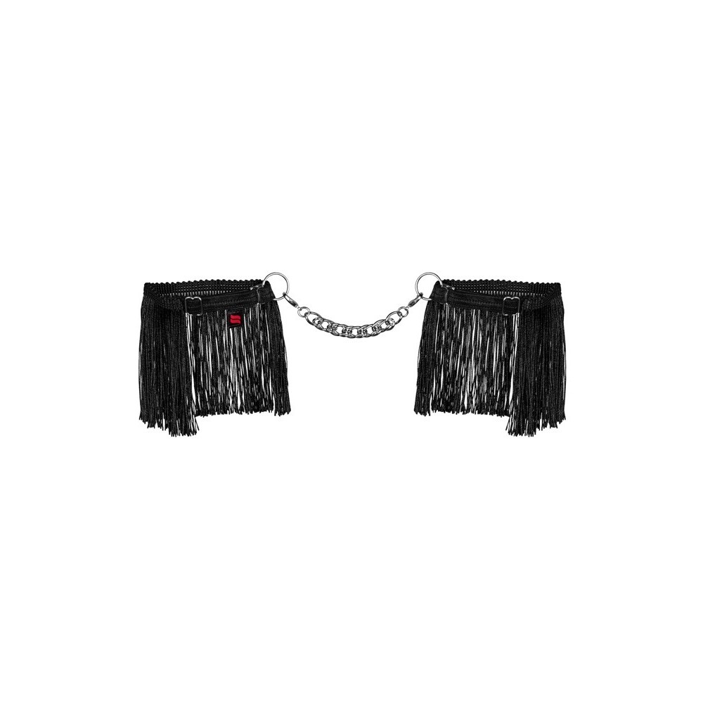 Menottes noires extravagantes Sherila by Obsessive avec franges décoratives. Deux bracelets élastiques, confortables et ajustables, sont ornés de franges douces et brillantes. La courte chaîne de liaison argentée peut être facilement attachée ou détachée des anneaux des menottes à l'aide de petits mousquetons.