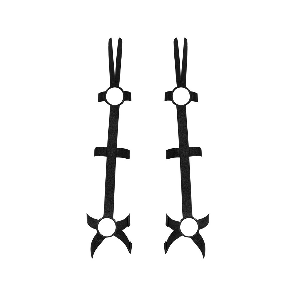 Paire de manchettes noires Armares de la marque Obsessive, de style strappy avec des anneaux décoratifs et des passants pour les doigts. Douces et élastiques, elles s'étendent de la main jusqu'au-dessus du coude. Entièrement réglables pour un maintien ferme et confortable. Une touche originale qui rehausse n'importe quelle tenue.