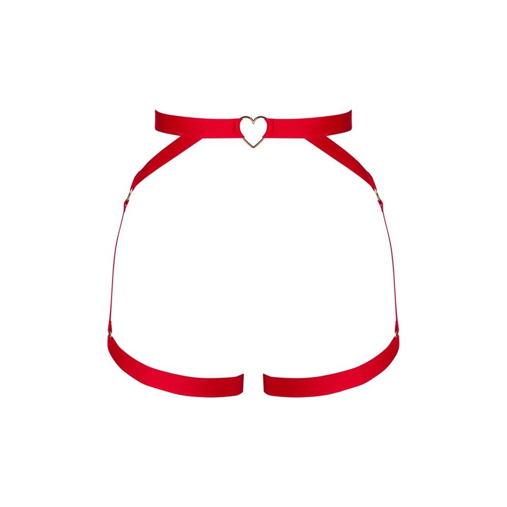 Le porte-jarretelles rouge Elianes d'Obsessive est composé de larges bandes élastiques douces, agrémentées de détails en anneaux dorés. Le porte-jarretelles avec jarretelles latérales et bandes pour les cuisses met élégamment en valeur les courbes du milieu du corps. Il est doté d'une fermeture à agrafes réglable dans le dos et d'un cœur décoratif en bijouterie à l'avant comme maillon central. Les lanières pour les cuisses sont également réglables pour un ajustement parfait.