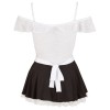 Haut en dentelle blanche avec fines bretelles réglables et manches pouvant être portées hors des épaules. Jupe noire opaque légèrement ample avec détails en dentelle blanche apparents et tablier inclus pour compléter le look séduisant.