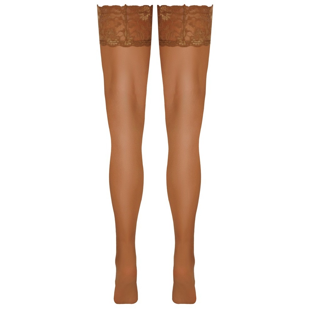 Bas à jarretelles légers, couleur chair, de la marque Cottelli LEGWARE, avec une bordure en dentelle de 9 cm de large. Intérieur renforcé de silicone pour un maintien antidérapant et un excellent soutien. Épaisseur du fil: 20 deniers. Certification Oeko-Tex. Les motifs de dentelle sont susceptibles d'être modifiés.