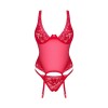 L'ensemble Lacelove en rouge combine un corset et un string avec de la dentelle florale, un ajustement parfait grâce à des bretelles réglables, une partie inférieure qui modèle doucement la poitrine et un pendentif argenté élégant. Le tissu élastique garantit un confort et un effet irrésistible en toute occasion.