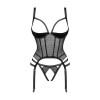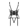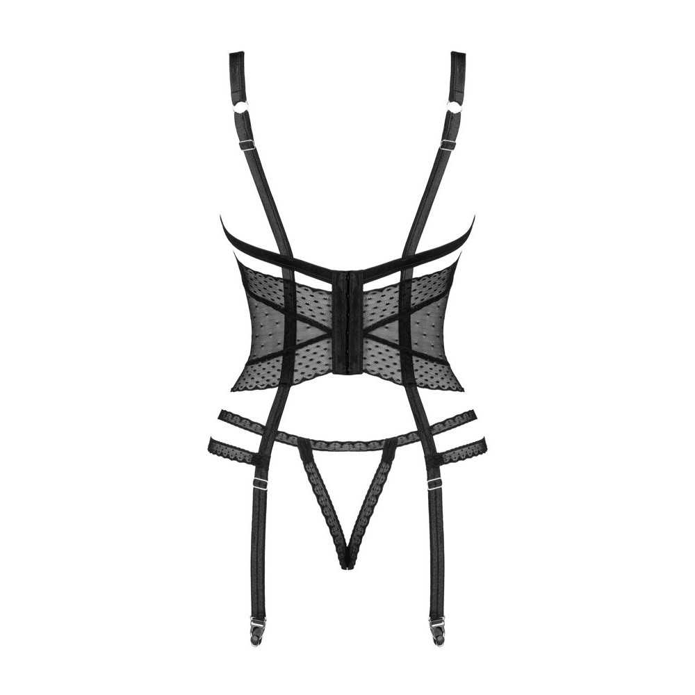 Le corset Lanelia noir associe une maille translucide sexy à un soutien-gorge ouvert, des bretelles et des jarretelles réglables, un pendentif argenté sur le buste et une fermeture à agrafes dans le dos. Il comprend un string ouvert à l'entrejambe pour un effet encore plus provocant et une matière élastique et agréable au toucher.
