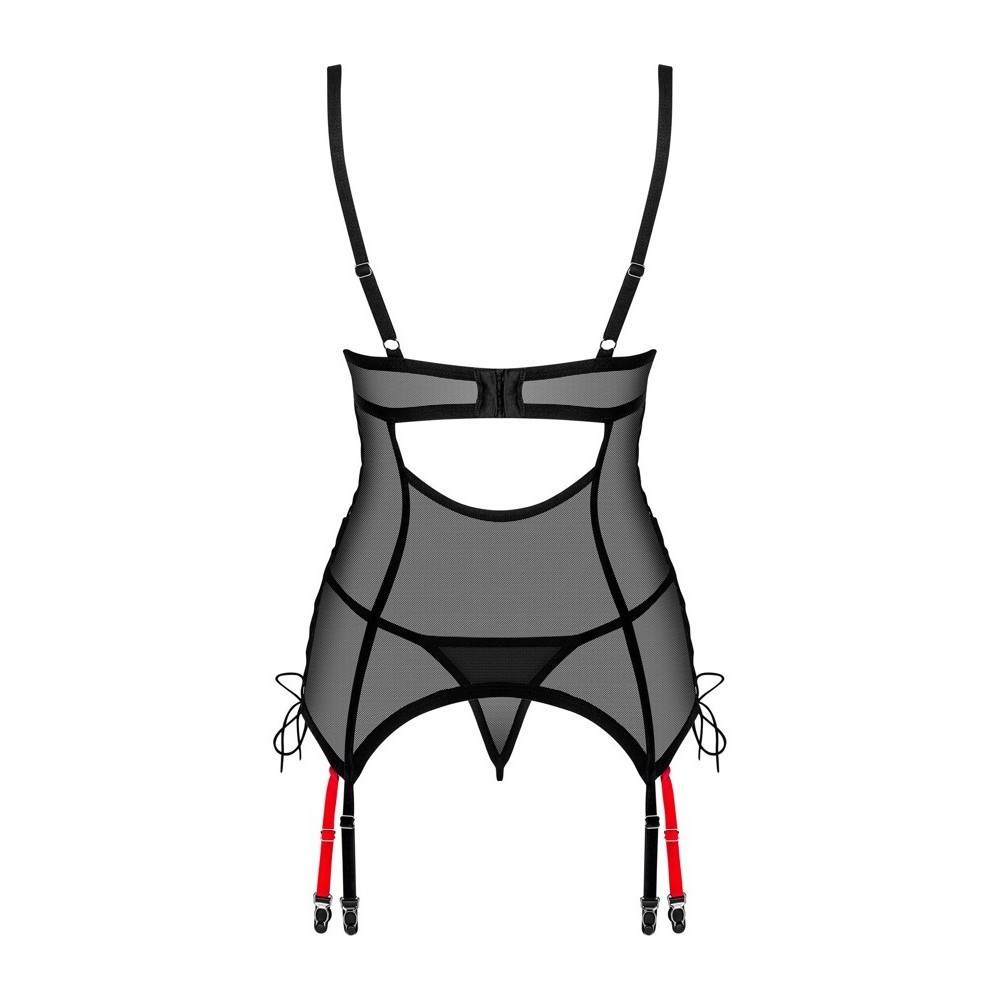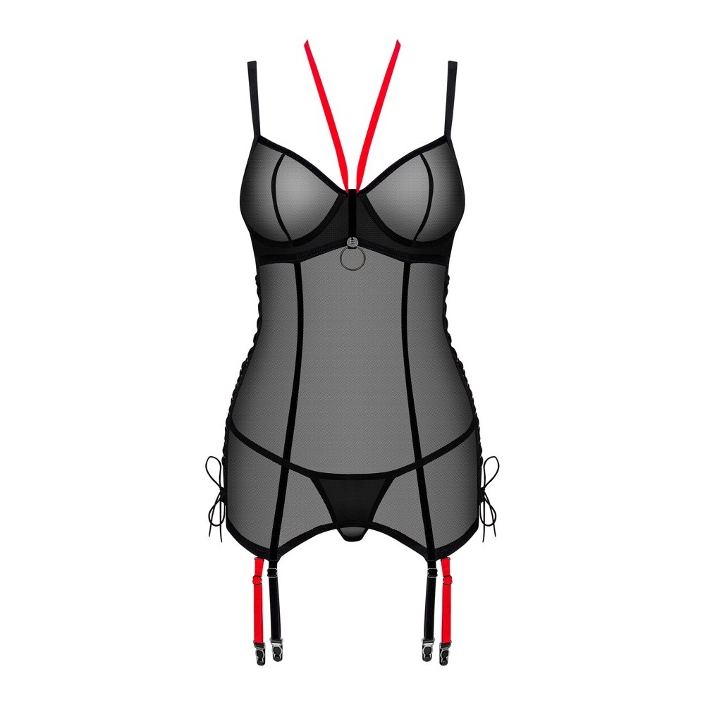 L'ensemble Glandez d'Obsessive associe un corset et un string à jarretelles en fine dentelle noire transparente, douce et élastique pour un confort parfait. Le corset présente un col roulé rouge contrastant, un anneau décoratif et un petit ornement entre les bonnets à armatures. Les cordons réglables sur les côtés, les bretelles, l'agrafe et les huit jarretelles permettent un ajustement entièrement personnalisé, tandis que les quatre bretelles rouges contrastées des jarretelles sont amovibles.