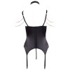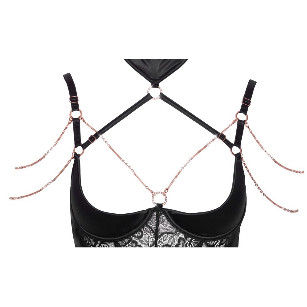 Corset avec string de la collection Abierta Fina, confectionné en satin élastique avec d'élégantes incrustations de dentelle et des détails dans des tons or rose. Le soutien-gorge intégré à armatures, doté de bonnets légèrement rembourrés, met la poitrine en valeur et la met en avant. Les deux bretelles réglables du décolleté se fixent aux bretelles du soutien-gorge et au tour de cou, créant un look sophistiqué et original. Le tour de cou est doté d'une fermeture à agrafe et à nouer. Les chaînes décoratives ornées de strass, placées sur la poitrine et les épaules, sont amovibles grâce à des boutons-pression. Comprend également un string sans entrejambe en satin élastique, avec une chaîne décorative amovible au niveau de l'entrejambe.