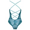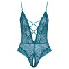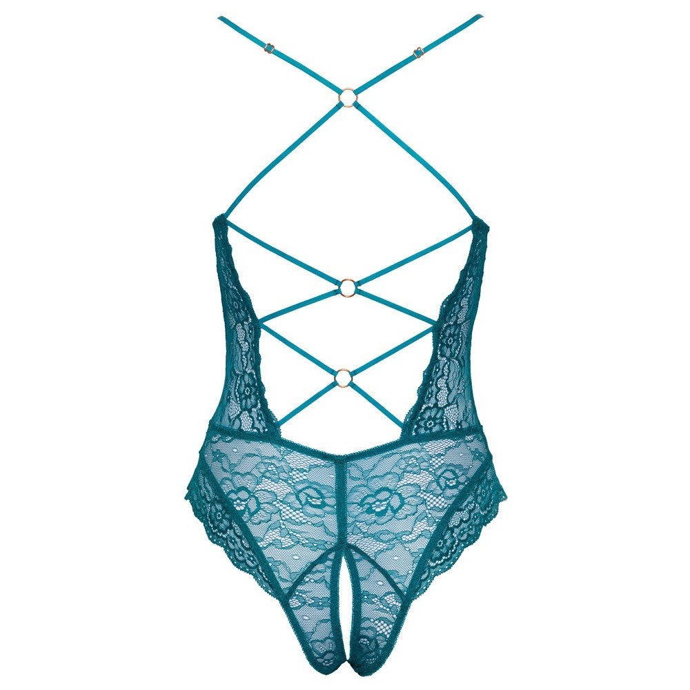 Body sans entrejambe de Cottelli LINGERIE, entièrement en dentelle douce de couleur bleu pétrole. Le devant et le dos sont extrêmement sensuels, avec des décolletés profonds, reliés uniquement par des anneaux décoratifs en or rose et des bandes élastiques. La zone de l'entrejambe est ouverte de manière invitante. Les bretelles sont réglables pour un ajustement parfait.