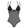 Le body Selinne noir d'Obsessive associe une maille élastique douce à des bonnets opaques en microfibre douce et des armatures roses contrastées, soulignant élégamment la poitrine. Le dos ouvert avec fermeture à agrafes réglable et le décolleté dos nu avec bretelles réglables garantissent un ajustement parfait, alliant confort et sensualité en un seul modèle.