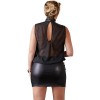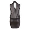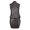 Mini-robe noire légère et ample, avec un haut transparent et sans manches qui met en valeur la silhouette. Petite découpe dans le dos et col montant à deux boutons, contrastant avec la jupe opaque et moulante qui souligne les courbes féminines.