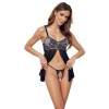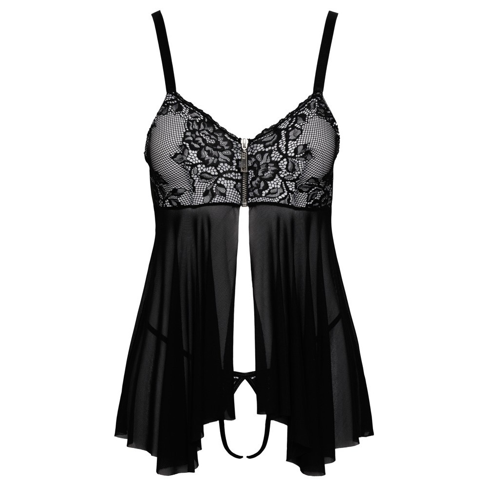 Chemise de nuit courte et fluide avec string sans entrejambe, dans un ensemble de Cottelli LINGERIE. Entièrement ouverte à l'avant, elle possède une fermeture éclair sur toute la longueur entre les bonnets blancs recouverts de délicate dentelle noire. Les bretelles sont réglables pour un ajustement parfait. Le string à cordon élastique séduit par son entrejambe ouvert.