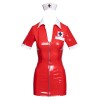 Robe courte Black Level avec charlotte incluse. La robe à manches courtes est en vinyle rouge brillant, avec des détails contrastés blancs et un emblème en forme de croix noire. Moulante, elle possède une fermeture éclair sur toute la longueur à l'avant. La charlotte en vinyle blanc peut être nouée et présente également un emblème en forme de croix sur le devant.