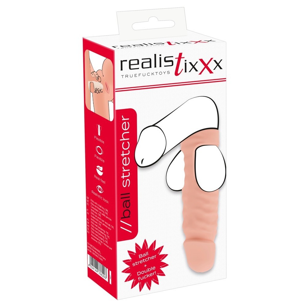 Le Ball Stretcher de Realistixxx comprend un gode, offrant une seconde stimulation pour des expériences plus intenses. Ce strap-on intelligent s'enfile en passant le large anneau sous les testicules (de préférence épilées) jusqu'à la base du pénis, puis les testicules sont tirées à travers les ouvertures latérales.