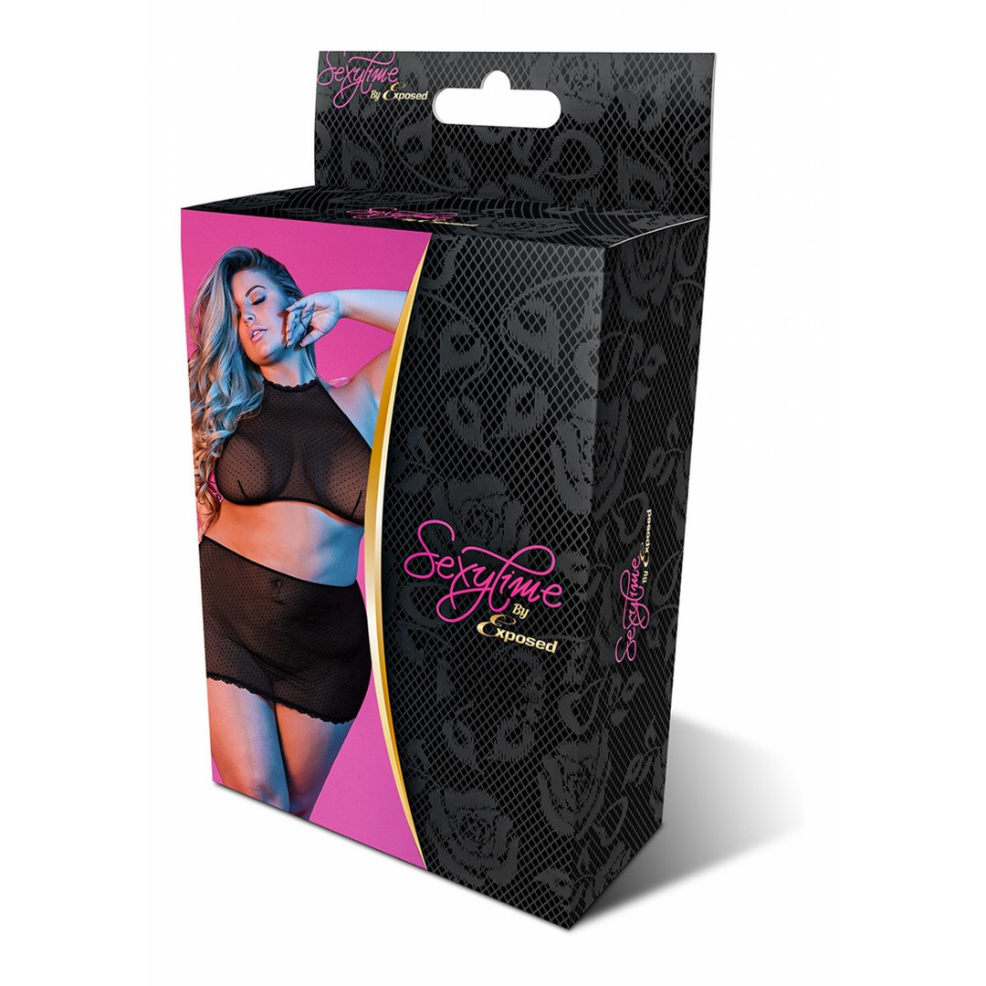 Issu de la collection Exposed by Magic Silk, ce modèle comprend un haut dos nu avec fermeture à agrafes en S dans le cou et dans le dos, accompagné d'une mini-jupe assortie. Ensemble deux pièces en maille douce, au design élégant et au toucher sensuel.