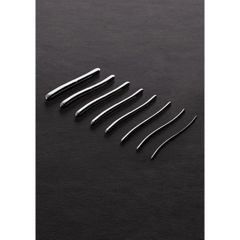 Ensemble de 8 sondes d'urètre en acier inoxydable de haute qualité. Chaque dilatateur est à double extrémité, avec des tailles graduées allant du n° 3-4 français au n° 17-18.