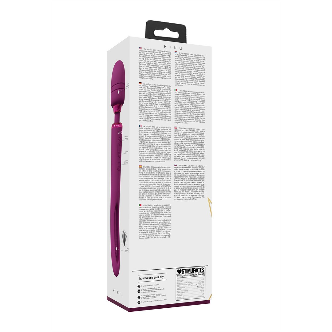 Il est équipé d'une batterie interne au lithium-ion qui peut être rechargée à l'aide d'un câble USB magnétique. Une charge complète garantit jusqu'à 70 minutes de plaisir continu. Comme tous les produits VIVE, KIKU est assorti d'une garantie d'un an, parce que le plaisir mérite aussi la confiance.