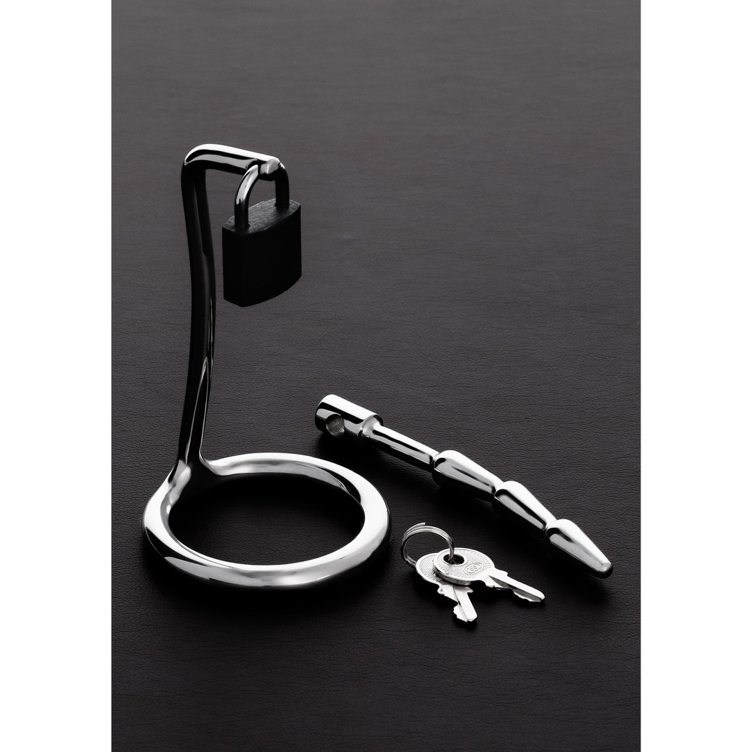 Anneau pour pénis en acier inoxydable avec plug urétral conique et trois protubérances, verrouillable pour contrôler l'érection.